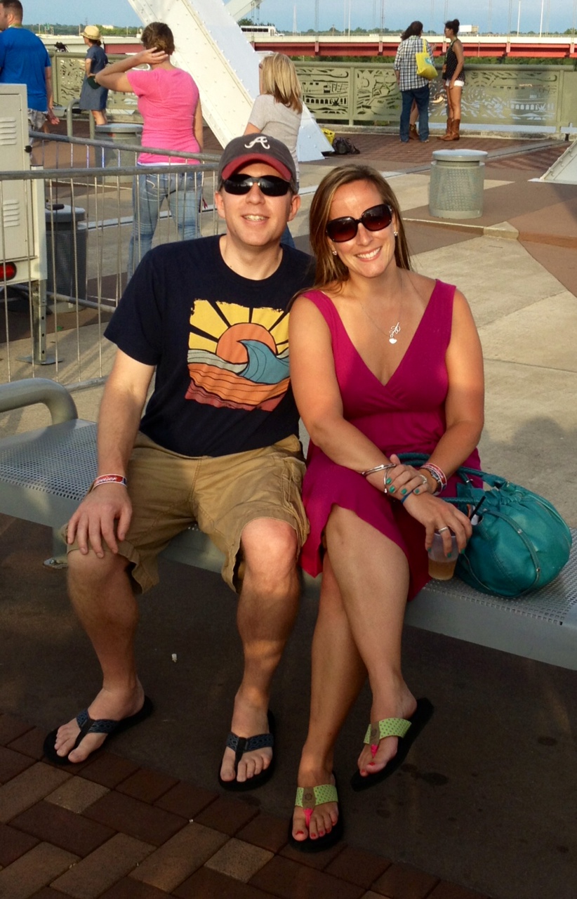 Almost a month ago (ah!...better late than never), we headed to the CMA Fest with some of our good friends! None of us had ever been before (not sure how that happened since I grew up here), so we were excited! Brad won tickets through the lottery at his company - and they were good seats which made it fun! We left the house and headed closer to downtown and stopped to get some drinks and late lunch. That was fun - and delicious!